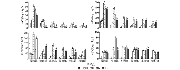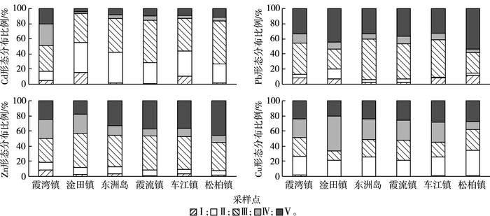 各采样点沉积物不同形态重金属所占比例各不相同。Cd在霞湾镇以无定形铁锰氧化物结合态、有机结合态和残渣态为主, 其余各采样点以碳酸盐结合态和无定形铁锰氧化物结合态为主; Pb在各采样点以无定形铁锰氧化物结合态和残渣态为主; Zn在霞湾以无定形铁锰氧化物结合态、有机结合态和残渣态为主, 在淦田镇以无定形铁锰氧化物结合态、有机结合态为主, 其余各采样点以无定形铁锰氧化物结合态与残渣态为主; Cu在各采样点的交换态比例很小, 其余各形态比例均较高。各采样点沉积物中Cd、Pb和Zn交换态比例明显高于Cu交换态比例。其中, 交换态比例最低的重金属是霞流镇和松柏镇的Cd(0.160 mg·kg-1), 最高的是霞湾镇的Zn(131.7 mg·kg-1)。