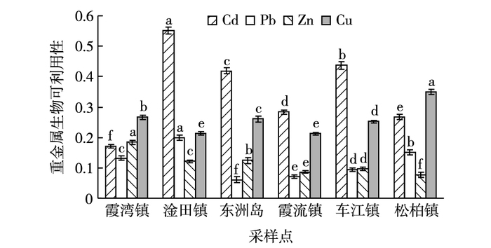 湘江中游各采样点沉积物Cd的生物可利用性差异极显著(P < 0.01), 从大到小依次为淦田镇、车江镇、东洲岛、霞流镇、松柏镇和霞湾镇, 淦田镇的Cd生物可利用性是霞湾镇的3.22倍; 各采样点Pb的生物可利用性差异极显著(P < 0.01), 从大到小依次为淦田镇、松柏镇、霞湾镇、车江镇、霞流镇和东洲岛, 淦田镇Pb的生物可利用性是东洲岛的3.25倍; 各采样点Zn的生物可利用性差异极显著(P < 0.01), 从大到小依次为霞湾镇、东洲岛、淦田镇、车江镇、霞流镇和松柏镇, 霞湾镇Zn的生物可利用性是松柏镇的2.38倍; 各采样点Cu的生物可利用性差异极显著(P < 0.01), 从大到小依次为松柏镇、霞湾镇、东洲岛、车江镇、淦田镇和霞流镇, 松柏镇Cu的生物可利用性是霞流镇的1.64倍。在各采样点中, 霞湾镇和松柏镇生物可利用性最高的重金属是Cu, 其余各采样点均为Cd。