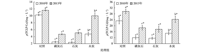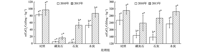 2.1.2 土壤重金属可浸出态和有效态由图 1可知, 土壤TCLP浸出态Cd的含量小于美国EPA规定的标准值[22]。添加木炭与磷灰石、石灰后显著降低了TCLP浸出态Cu和Cd含量(P < 0.05), 且2013年各处理组TCLP浸出态Cu和Cd含量较2010年显著增加(P < 0.05)。这可能是由于江西鹰潭处于酸雨沉降区[20], 土壤pH值明显降低, 导致土壤中Cu和Cd的可浸出性随时间推移显著增加。