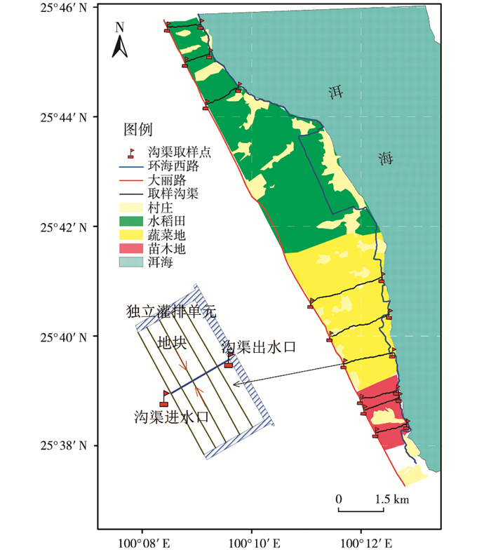 农田灌排沟渠是连接农田和下游受纳水体之间的纽带, 是向下游水体输送氮磷等物质的重要通道, 作为农田流失氮、磷的“汇”及下游受纳水体污染的“源”[9], 其水质状况与周边种植类型存在复杂的相关关系[10]。不同种植类型农田沟渠径流氮、磷浓度变化既反映该种植类型农田氮、磷输出的新增负荷和对上游农田来水的消纳净化, 又表征沟渠对农田尾水的截留净化能力, 也是实现农田流失氮、磷“源-汇”功能转换的重要场所[9]。目前, 对南方平原水网区不同种植类型氮磷流失特征研究较多[2-4], 但对山区/半山区洱海近岸农田不同种植类型农田沟渠径流氮、磷流失特征还鲜有研究。以洱海西岸苗木地、菜地和稻田3种种植类型农田内的典型灌排单元为对象, 研究农田沟渠径流氮、磷浓度变化特征, 探讨不同种植类型对农田沟渠径流氮、磷浓度的贡献率, 以期为当地调整传统种植结构,合理优化不同种植空间格局提供技术支撑, 以降低农田氮、磷等污染物输出, 保护洱海水质安全。