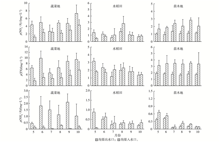 3 结论不同种植类型对沟渠出水口径流氮磷浓度的影响从大到小依次为为菜地、稻田和苗木地。菜地沟渠出水口径流中各形态氮磷浓度均大于沟渠入水口, 而苗木地则相反。在5、6月稻田沟渠出水口径流中各形态氮磷浓度大于沟渠入水口, 而其它月份则相反。3种种植类型下无机氮是沟渠径流中主要的氮素形态, 占TN浓度的70.32%~81.49%。无机氮中流失量最大的是NO3--N, 占无机氮的75.13%~84.75%。DTP是沟渠径流中主要的磷形态, 占TP的70.33%~79.33%。菜地对沟渠径流中TN、NH4+-N、NO3--N、TP和DTP浓度的贡献率最大, 分别为56.41%、85.81%、44.61%、66.17%和64.80%;其次是稻田, 贡献率分别为-4.50%、-15.14%、-10.01%、-0.85%和-0.29%;苗木地最小, 贡献率分别为-89.88%、-64.81%、-96.49%、-72.11%和-69.69%。