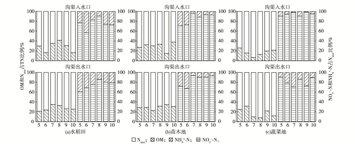菜地沟渠出水口径流中有机氮(ON)浓度占TN的29.68%(图 4), 其次是稻田(27.41%)和苗木地(17.36%), 这与不同种植类型的有机肥施用量、复种指数及降雨密切相关[2]。在5、7和8月稻田沟渠出水口径流中ON/TN较大, 主要是因为5月种水稻时施入有机肥, 然后翻耕泡田, 而7、8月降雨量多, 径流量大, 导致ON流失量增加。菜地月际间沟渠径流中ON/TN相差不大, 主要是因为菜地复种指数高, 一年最多种4季, 频繁的施肥、翻耕及灌溉排水等农事活动增加了有机氮的流失风险。苗木地沟渠出/入水口径流间ON/TN相差不大, 这与苗木地不用有机肥和少的农事活动有关。