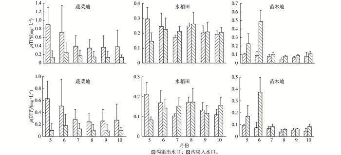 菜地每月沟渠出水口径流TP和DTP浓度大于沟渠入水口(图 5), 主要是因为蔬菜地频繁的翻耕、施肥和灌溉等农事活动, 加速了土壤侵蚀及表层土中DTP的溶出。沟渠出水口径流TP浓度在5、6月远大于地表Ⅴ类水标准, 其他月份低于地表Ⅴ类水标准。稻田5、6月沟渠出水口径流TP和DTP浓度大于沟渠入水口, 9月沟渠出水口径流TP和DTP浓度相差不大, 这主要与5、6月稻田翻耕、施肥、泡田栽秧等农事活动及9月收割前的排水落干有关。其他月份沟渠出水口径流TP和DTP浓度小于沟渠入水口。稻田沟渠出水口径流TP浓度在地表水Ⅲ~Ⅳ类之间。苗木地每月沟渠出水口径流中TP和DTP浓度小于沟渠入水口径流中TP和DTP浓度, 沟渠出水口径流TP浓度也低于地表Ⅲ类水标准。