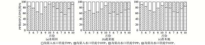 DTP是沟渠径流中主要的磷形态, 占总磷的70.33%~79.33%(图 6), 一般认为农田径流磷流失以PP为主, 这已被许多研究[19-23]证实, 但农田径流流失的磷进入沟渠后, 通过沟渠植物拦截吸附、颗粒沉降后, 沟渠径流中磷形态以DTP为主, 这与KLEINMAN等[24]研究结果一致。菜地沟渠出水口径流中PP/TP较大, 为29.67%, 其次是稻田(23.13%)和苗木地(20.67%)。这与农田翻耕频率、施磷水平及土壤磷累积有关, 磷流失取决于径流量、土壤流失量和土壤中的磷累积, 菜地施磷量大, 施入的磷大部分在表土富集, 加之翻耕频繁, 表土疏松, 有利于径流冲刷, 大量磷随土壤进入水体。稻田和苗木地翻耕次数少, 施磷量少, 所以沟渠径流PP浓度小。3种种植类型在7、8月PP/TP比值较其他月份大, 这是因为7、8月降雨量大, 沟渠径流量增多, 增加了对农田土壤及沟道底泥的冲刷, 所以PP浓度较大。