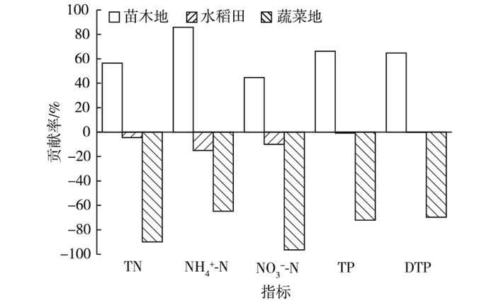 3种种植类型的农田沟渠兼顾灌排功能, 沟渠上游来水通过灌溉进入菜地、稻田或苗木地达到消纳的目的, 同时多余灌溉水或降雨产生的径流又会携带该种植类型下新增的氮磷重新进入相同沟渠, 这种梯级网络化农田对沟渠水反复灌溉和排放, 从而实现灌排单元尺度农田沟渠径流N、P浓度的增减变化。图 7表明苗木地对沟渠径流氮磷浓度的贡献率最低, 对TN、NH4+-N、NO3--N、TP和DTP的贡献率分别为-89.88%、-64.81%、-96.49%、-72.11%和-69.69%。其次是稻田, 对TN、NH4+-N、NO3--N、TP和DTP的贡献率分别为-4.50%、-15.14%、-10.01%、-0.85%和-0.29%。最高为菜地, 沟渠径流通过菜地后, TN、NH4+-N、NO3--N、TP和DTP分别增加56.41%、85.81%、44.61%、66.17%和64.80%。3种种植类型沟渠出/入水口水量一致的条件下, 苗木地发挥了“汇”的作用, 稻田基本达到“源-汇”平衡, 菜地发挥了“源”的作用。
