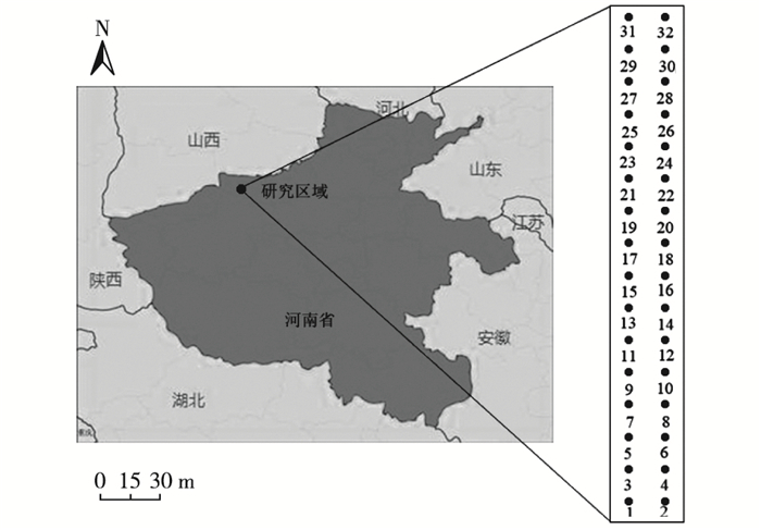 1 材料与方法 1.1 样点布设与样品采集研究区域位于河南省某重金属污染农田修复试点区, 土壤为褐土, 碳酸钙含量较高, pH呈弱碱性, 研究区域土壤理化性质如下:pH值为8.3, 阳离子交换量为13.1 cmol·kg-1, w(有机质)为19.1 g·kg-1, w(全氮)为1.0 g·kg-1, w(全磷)为0.7 g·kg-1, w(全钾)为10.0 g·kg-1, w(碱解氮)为81.7 mg·kg-1, w(速效磷)为24.8 mg·kg-1, w(速效钾)为107.7 mg·kg-1。农作物分两季种植, 每年6月至9月种植玉米, 10月至次年5月种植冬小麦, 属华北平原的边缘地带, 气候冷热分明, 干旱或半干旱季节明显, 年降水量为640~680 mm, 夏季炎热, 降雨集中, 冬季寒冷, 雨雪稀少。