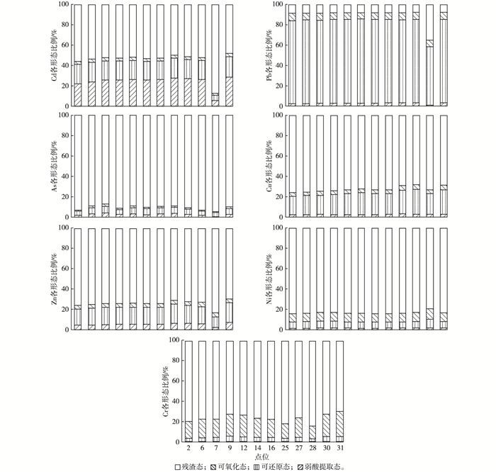 2.2 重金属形态分析重金属元素在土壤中以不同形态存在, 存在形态的不同对重金属的迁移规律、变化形式和生物有效性都有一定影响[29]。原位稳定化主要通过降低重金属活性、减少植物对重金属的吸收作用以降低重金属对农作物的毒害作用, 因此, 土壤重金属的形态分布与活性含量研究对制定稳定化方案意义较大。由于研究区土壤重金属分布较均匀, 故随机选取12个样品分析不同元素的形态分布, 结果见图 2。