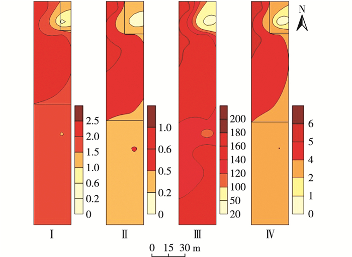图 3 土壤重金属全量分布与弱酸提取态含量分布 Figure 3 Distribution of contents of weak acid extractable heavy metals and total of heavy metals in the soil Ⅰ—Cd-全量; Ⅱ—Cd-弱酸提取态; Ⅲ—Pb-全量; Ⅳ—Pb-弱酸提取态。重金属含量单位为mg·kg-1。 |