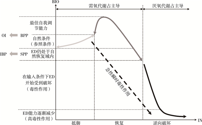 TIXIER等[70]对城市雨水塘生态系统的2种功能进行了定义。其中,生态系统的第1种功能可定义为自净能力(SPP),反映了生态系统消纳所有输入物质的能力。雨水塘调蓄洪峰,防止水力侵蚀,可采用调蓄容积与滞留时间等参数进行水力调控。而在这些参数所确定的具体边界内,SPP可描述出营养物物质循环与污染物净化过程中生物(生物代谢)、物理(水文地貌过程、水交换动力学等)和化学(氧化还原电位、络合物、重金属形态)因素的协同作用,并使其具有时间与空间尺度效应[71]。生物质量状态的改善在空间尺度上可表示为雨水塘输入与输出物质间的差异性;而在时间尺度上则表示为雨水塘在实施修复计划前、后生物状态恢复的差异性。因此,SPP的质量目标可直接定义为生态系统功能的修复或保护,并使生态系统处于生态恢复域的边界内(图 1)。该边界由最大环境压力源所确定,系统在该边界内可通过自我调节能力快速得以恢复而不改变其稳态结构。由于生态系统在恢复域内仍可维持一个可接受的生态条件范围,从而表现出最小的毒性效应,并维持系统的主要生态功能,即系统在恢复域内可表现出“生态防御”(ecosystem defences,ED)功能。而第2种功能可定义为生物多样性保护能力(BPP),即生态系统达到并维系最大可能生物多样性的能力,采用物种与过程丰度进行表示。由图 1可知,BPP近似但不同于未受污染的静态参照系统所形成的生物多样性。