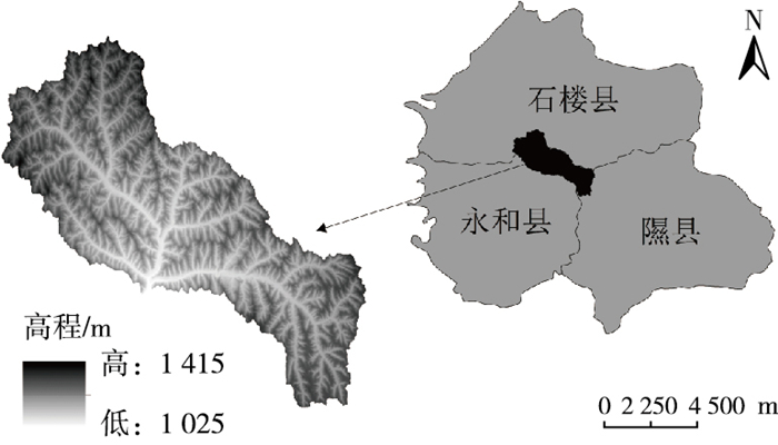 1 研究数据与方法 1.1 研究区概况岔口小流域位于山西省西南部永和县、石楼县和隰县交界地带, 涉及永和县4个行政村, 隰县和石楼各1个自然村, 总面积131.91 km2, 地处北纬36°47'26"~36°57'14", 东经110°38'01"~110°50'02", 平均海拔1 184 m。研究区属于典型的暖温带半干旱大陆性季风气候区, 四季分明, 日照时间长, 多年平均气温8.6 ℃, 多年平均降水530.9 mm, 并多集中在7—9月, 约占全年降雨量的62.25%。流域内河流属季节性河流, 丰水期为历时很短的洪水径流且径流中携带大量泥沙和营养物质。研究区位于典型的黄土丘陵沟壑区, 流域内沟壑纵横, 导致水土流失严重, 生态环境脆弱。流域内共有17种土壤类别, 土壤质地以粉砂质壤土为主, 湿陷性较大。研究区主要土地利用类型为耕地、园地、林地、草地、水域和居民点, 其中林地面积占比较大。流域内产业结构单一, 以农业生产为主, 经济发展迟缓, 无较大城镇,无大型养殖场和工业企业, 因此可以不考虑点源污染。研究区示意图见图 1。