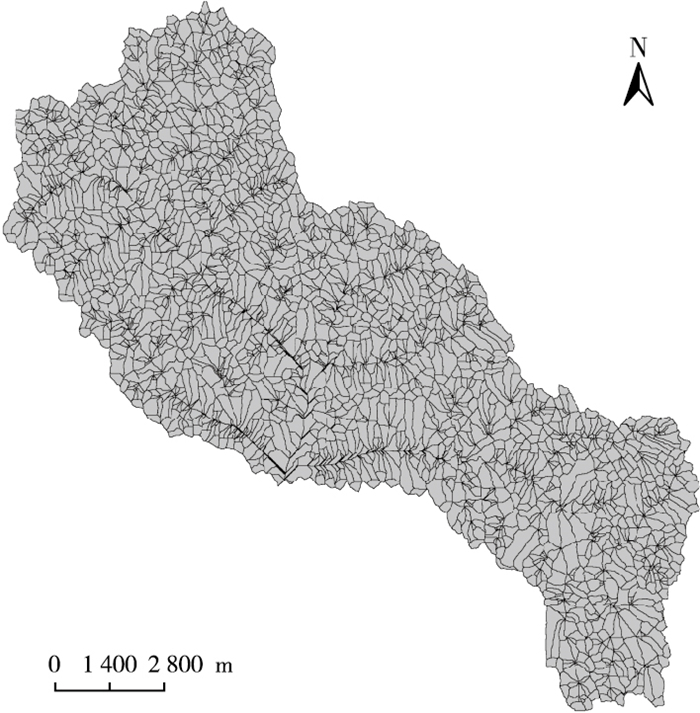 模型包括水文、土壤侵蚀和污染物迁移等模块; 基础数据库主要有气象、地形、土壤和土地利用数据库。流域地形数据选用分辨率为10 m的数字高程模型栅格数据。流域土地利用现状图参考第2次全国土地调查土地利用现状数据, 以2013年QuickBird影像为底图进行全流域野外实地调查生成。径流曲线数CN值参考取值条件和流域不同的土地利用方式、土壤类别及植被覆盖等确定; 流域内作物、田间管理和肥料数据主要通过入户调查和实地采样测得; 蓄水坝数据通过岔口小流域坝系工程设计文本和实地调查获得; 土壤数据由永和县土壤1:5万地图经矢量化得到; 土壤理化性质主要通过实地采样获得; 土壤可蚀性K值根据土壤粒径含量并参考诺莫图获得; 气象数据为2001—2013年永和县气象站逐日气象资料数据(露点温度、云覆盖、每日地面太阳辐射等通过经验公式间接获得[14-15])和流域内设立的3个雨量监测站实测数据。根据流域实际情况, 最终确定临界源面积(CSA)和最小初始沟道长度(MSCL值)分别为5 hm2和100 m, 将流域划分为8 121个子流域(图 2)。将模型所需基础信息数据导入模型输入编辑器, 初步建成岔口小流域AnnAGNPS模型。