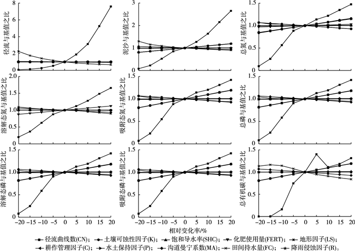 在参数初步率定的基础上, 结合模型机制结构, 同时兼顾模型操作运算情况, 从可能对模型输出结果有影响的参数中筛选出与SCS-CN径流曲线数模型、RUSLE方程和营养盐输出模拟过程等有关的10个参数(表 1)进行相对系统的敏感性分析。