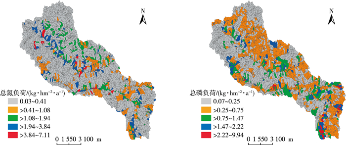 氮磷污染物负荷空间分布不具一致性, 但区域性明显。土壤氮磷库即施肥量是氮磷污染物的主要来源; 总氮流失主要与径流冲刷有关, 总磷流失主要与泥沙侵蚀有关。