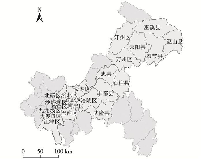 三峡库区(重庆段)东高西低, 四季分明, 气候类型明显, 平均气温在15~18 ℃之间, 该区域多年年平均降雨量达1 150.26 mm, 雨量充沛但空间分布不均匀。库区土地资源总量多, 但人均土地面积少。土壤类型主要有紫色土、粗骨土、石灰土和水稻土等。库区内植被类型多, 且全区矿产资源种类繁多, 资源丰富。