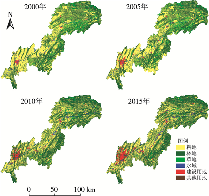 从表 2可知, 耕地和林地所占比例较大, 草地、水域、建设用地和未利用地所占比例较小; 景观利用程度高, 未利用地面积所占比例一直最小, 2000—2015年其他用地面积所占比例不足0.05%;社会经济转型, 城镇化与三峡移民引发的安置、迁建等因素使建设用地扩展较快, 2000—2015年建设用地面积从449.94增加到2 113.61 km2, 所占比例从0.973%增加到4.571%;2000—2015年林地面积比例由38.755%增加到50.036%, 其中2010年林地面积比例最大,生态环境有所改善; 三峡大坝建成后, 水库高水位蓄水造成水域面积逐渐增加, 2000—2015年水域面积从777.44增加到1 317.31 km2。
