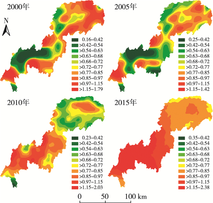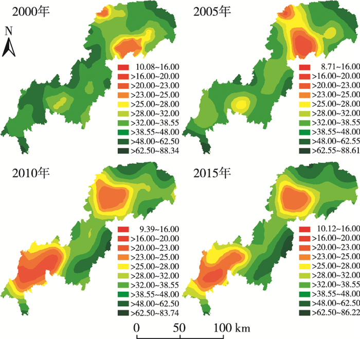 图 3 2000—2015年三峡库区(重庆段)斑块密度的空间分布 Figure 3 Spatial distribution of the index of patch density in the Three-Gorge Reservoir Area (Chongqing Section) of the period from 2000 to 2015 |