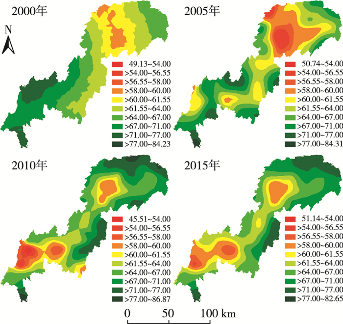 图 4 2000—2015年三峡库区(重庆段)景观聚集度指数的空间分布 Figure 4 Spatial distribution of the index of landscape aggregation in the Three-Gorge Reservoir Area (Chongqing Section) of the period from 2000 to 2015 |