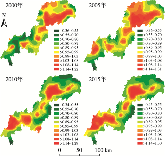 由图 3可以看出, 2000—2005年三峡库区(重庆段)主城及其周围区域的斑块密度较低, 而其他地区相对较高, 说明主城及其周围区域的景观完整性好; 2010年后景观分布格局发生显著变化, 景观破碎化程度逐渐向主城及主城周围转移, 而研究区东北地区破碎化程度明显减弱。