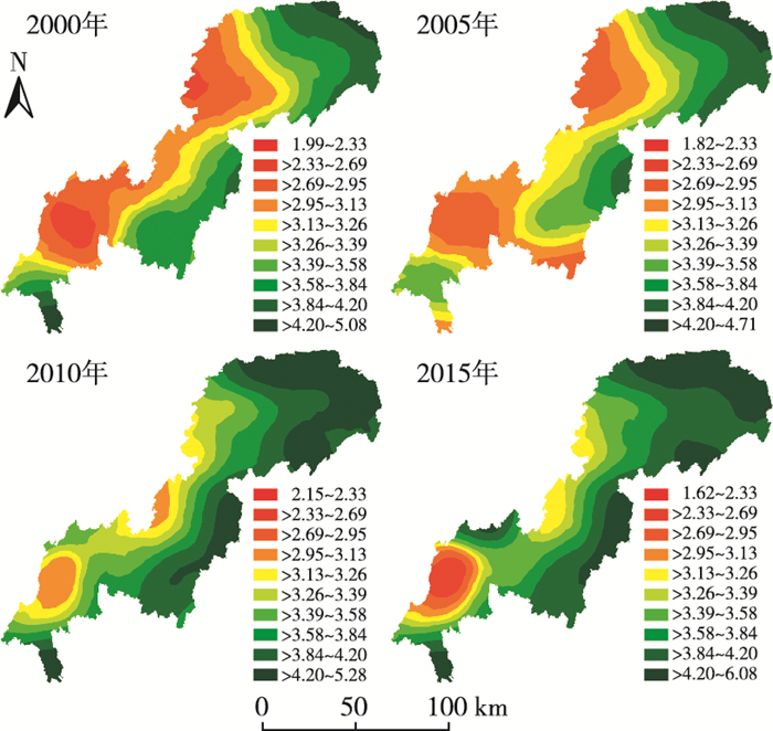 由图 5可以看出, 三峡库区(重庆段)香农多样性指数呈斑块状分布, 2000—2005年低值区集中分布在库区主城周围和库区南部, 高值区分布在东北部, 说明2000—2005年库区东北部景观破碎化程度高; 2010—2015年高值区分布在长江流域一带, 低值区分布在库区东北部和东部, 说明库区东北部和东部景观类型单一, 景观格局完整。