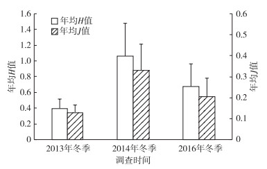 2013、2014和2016年拉市海冬季水鸟月均H值逐月递增。由图 5可知, 11月拉市海水鸟H值偏低, 月均值为0.487±0.029, 后2个月略微增加, 次年2月增至0.768±0.333, 次年3月H值最高, 为1.072±0.611。与拉市海2013、2014和2016年冬季水鸟月均数量和种类变化(图 3)对比发现, 11月—次年2月水鸟数量和种类一直呈增长趋势, 使得H值增长; 3月, 部分水鸟回迁, 水鸟数量和种类都下降, 但由于过境鸟对于种类的补充, 使得数量下降幅度明显高于种类, 因而多样性不降反增。J值的月均值变化趋势与H值变化非常一致, 进一步验证了拉市海冬季水鸟的变化情况。