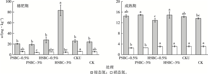 图 2 施加不同类型生物炭对穗肥期和成熟期土壤铵态氮和硝态氮含量的影响 Figure 2 Effects of applying different types of biochar on ammonia nitrogen and nitrate nitrogen content in panicle and mature soil PSBC-0.5%和PSBC-3%分别指锯末裂解生物炭施加量w为0.5%和3%, HSBC-0.5%和HSBC-3%分别指锯末水热炭施加量w为0.5%和3%, CKU为施氮肥对照, CK为不施氮肥对照。直方柱上方英文小写字母不同表示处理间铵态氮或硝态氮含量差异显著(P < 0.05) |