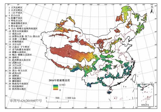 图 1 2016年优先区域植被覆盖度 Fig. 1 FVC in priority areas for terrestrial biodiversity conservation in 2016 |