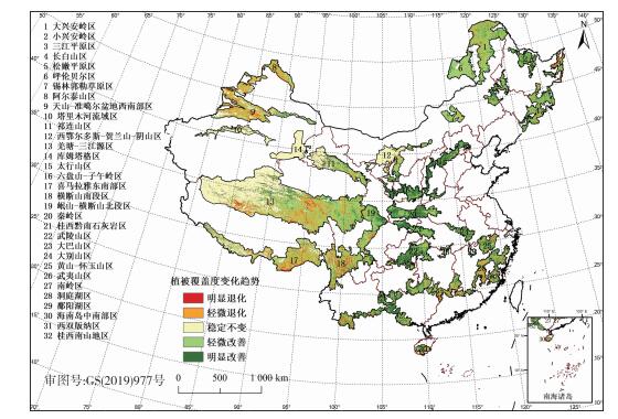 如表 2所示, 从每个优先区域来看, 2001—2016年有24个优先区域植被覆盖度以改善为主。其中, 六盘山-子午岭区、太行山区、武陵山区、秦岭区、大别山区、桂西黔南石灰岩区、桂西南山地区、大巴山区、小兴安岭区、松嫩平原区和西双版纳区11个优先区域植被覆盖度以明显改善为主; 呼伦贝尔区、锡林郭勒草原区、大兴安岭区、长白山区、岷山-横断山北段区、横断山南段区、南岭区、黄山-怀玉山区、武夷山区、鄱阳湖区、洞庭湖区、三江平原区和海南岛中南部区13个优先区域植被覆盖度变化以轻微改善为主; 而阿尔泰山区和天山-准噶尔盆地西南部区2个优先区域植被覆盖度变化以退化为主, 库姆塔格区、塔里木河流域区和西鄂尔多斯-贺兰山-阴山区3个优先区域年均植被覆盖度变化以稳定不变为主。