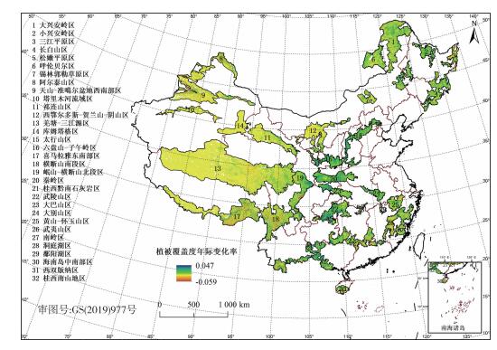 图 2 2001—2016年优先区域植被覆盖度变化率空间分布 Fig. 2 Spatial distribution of FVC variation slope in priority areas for terrestrial biodiversity conservation during 2001-2016 |
