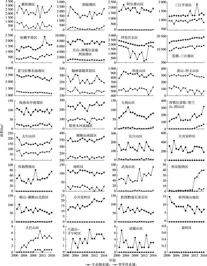 2016年, 有24个优先区域分布有常年性水域, 主要为中部地区的大型湖泊、西部地区的高原湖泊群和东北地区的中小型湖泊。2001—2016年有16个优先区域常年性水域面积增加, 有19个优先区域丰水期水域面积增加。总体来看, 优先区域水域面积总体呈增加趋势, 其中, 羌塘-三江源区、松嫩平原区和西鄂尔多斯-贺兰山-阴山区3个区域增加趋势较明显; 鄱阳湖区丰水期水域面积总体增加, 但是常年性水域面积呈减少趋势。