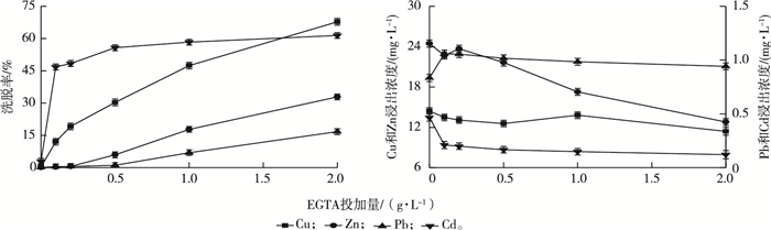 图 1 EGTA投加量对土壤重金属洗脱率和浸出浓度的影响 Fig. 1 Effect of EGTA dosage on removal rate and leaching concentration of heavy metals in soil |