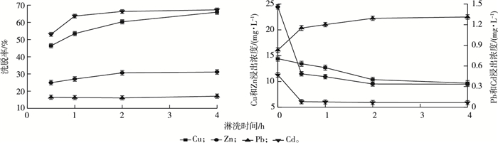 图 2 淋洗时间对土壤重金属洗脱率和浸出浓度的影响 Fig. 2 Effect of washing time on removal rate and leaching concentration of heavy metals in soil |