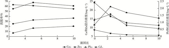 图 3 液固比对土壤重金属洗脱率和浸出浓度的影响 Fig. 3 Effect of liquid-solid ratio on removal rate and leaching concentration of heavy metals in soil |