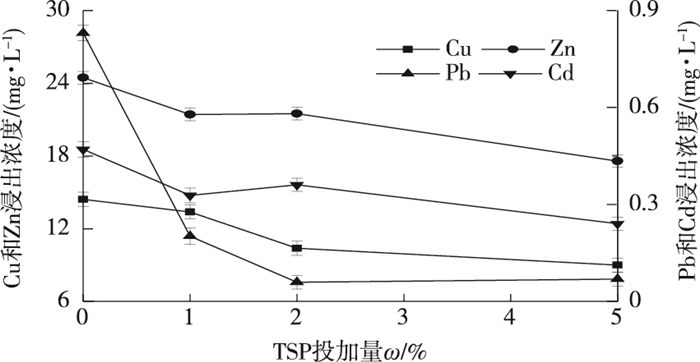 图 4 TSP投加量对土壤重金属浸出浓度的影响 Fig. 4 Effect of TSP dosage on leaching concentration of heavy metals in soil |