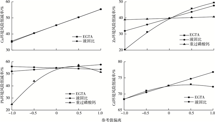 Cu、Zn和Cd的环境风险削减率主要受EGTA投加量和液固比的影响,液固比和EGTA投加量的增加均能提高3者的环境风险削减率(图 5)。一方面,这是因为EGTA对土壤中Cu和Cd的洗脱率较高,另一方面,EGTA淋洗能显著降低Zn和Cd浸出浓度;因此单独淋洗就可以大幅度降低Cu、Zn和Cd的环境风险。