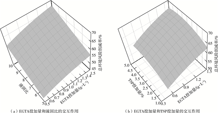 2.3.2 因素互作响应面分析TSP投加量取中值(3%)时,EGTA投加量和液固比的交互作用对重金属总环境风险削减率(β)的影响见图 6(a)。图 6(a)显示,β随着EGTA投加量和液固比的增加而增加,两者呈现较好的协同作用。液固比取中值(7.5)时,EGTA投加量和TSP投加量的交互作用对β的影响见图 6(b)。当TSP投加量一定时,随着EGTA投加量的增加,β先增大后趋于平稳。当EGTA投加量一定时,随着TSP投加量的增加,β先增大后趋于稳定;当EGTA投加量为1.1~1.5 g·L-1时,β高于61%。总体上,增加EGTA投加量对β的影响幅度更大。
