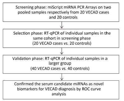 Study FlowThe study flow was shown in Figure 1. A two-phase case-control study was designed to identify serum miRNAs as potential biomarkers for very early-onset CAD. An miScript miRNA PCR Array analysis was performed to screen and select miRNAs that showed significant changes in pooled serum samples between patients with very early-onset CAD (n=20) and controls (n=20). Differentially expressed miRNAs were examined in the same cohort that was used for screening (training set). We then detected those altered miRNAs in a larger cohort including 40 patients with very early-onset CAD and 40 controls (validation set). Finally, ROC curve analysis was used to confirm the diagnostic value of these identified miRNAs.