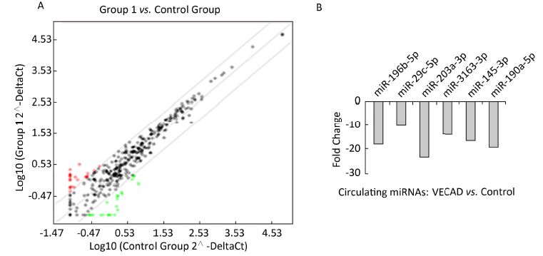 | Figure 2 Circulating miRNA expression profile in patients with very early-onset CAD and control subjects. (A) a scatter plot showing the results of 372 differentially expressed miRNAs in patients with very early-onset CAD compared with healthy controls. Red plot, overexpressed miRNAs; green plot, underexpressed miRNAs; black, no change. The two groups of samples are control group and group 1 (very early-onset CAD); (B) bars show the fold changes of significantly downregulated miRNAs. | |