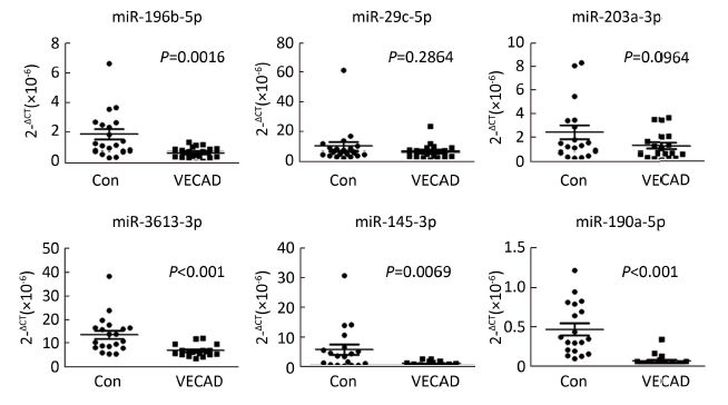 | Figure 3 Differential expressions of the six miRNAs in the serum of patients with very early-onset CAD and controls. The expression levels of the six miRNAs are detected by RT-qPCR individually. Serum levels of the six miRNAs were measured in 20 very early-onset CAD cases and in 20 controls of the training set. Each P value was derived from a two-tailed Student's t-test. | |