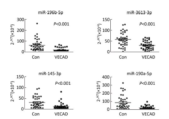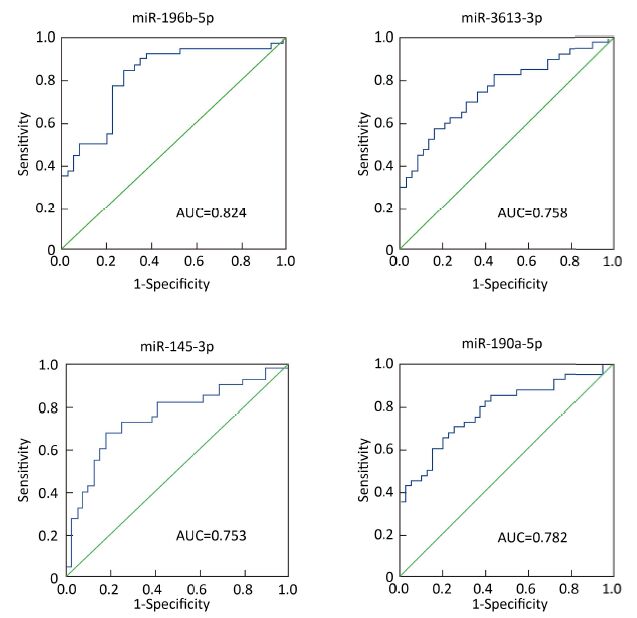 Results A total of 22 overexpressed miRNAs and 22 underexpressed miRNAs were detected in the initial screening. RT-qPCR analysis of the miRNAs obtained from the initial screening revealed that four miRNAs including miR-196-5p, miR-3163-3p, miR-145-3p, and miR-190a-5p exhibited significantly decreased expression in patients compared with that in controls (P<0.05). The areas under the receiver operating characteristic curve for these miRNAs were 0.824 (95% CI, 0.731-0.917; P<0.001), 0.758 (95% CI, 0.651-0.864; P<0.001), 0.753 (95% CI, 0.643-0.863; P<0.001), and 0.782 (95% CI, 0.680-0.884; P<0.001), respectively, in the validation set.