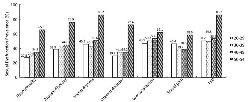 The mean FSFI scores for the groups of participants aged 20-29 years, 30-39 years, 40-49 years, and 50-54 years were 24.35, 24.40, 23.77, and 18.54, respectively; the mean score for FSFI related to desire was 3.21, 3.13, 3.04, and 2.42, respectively; that for FSFI related to arousal was 3.60, 3.65, 3.43, and 2.41, respectively; that for FSFI related to lubrication was 4.54, 4.66, 4.47, and 3.24, respectively; that for FSFI related to orgasm was 4.08, 4.04, 4.01, and 2.99, respectively; that for FSFI related to satisfaction was 4.42, 4.26, 4.12, and 3.70, respectively; and that for FSFI related to pain was 4.50, 4.66, 4.70, and 3.58, respectively. Compared to participants in the other age groups, those aged ≥ 50 years had lower FSFI and scores across the six domains (all P < 0.05). The prevalence of sexual dysfunction among participants in different age groups was shown in Figure 1. Compared with participants aged 20-29 years, those aged ≥ 50 years had a higher prevalence of hyposexuality, arousal disorder, vaginal dryness, orgasm disorder, low satisfaction, sexual pain, and total FSD. However, participants aged 30-39 years and 40-49 years were not found to have a significantly higher prevalence of dysfunction across the six domains and total FSD than those of participants aged 20-29 years.