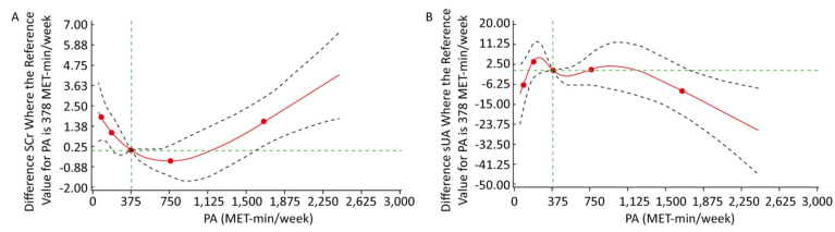 These above inconsistent results may be caused by nonlinear association between PA and Scr/sUA. In other words, PA classification (sedentary/moderate/high) in these studies is not a suitable method to show association of PA and Scr/sUA. Therefore, in our study, PA is classified by the dose-response relationship between PA and Scr/sUA firstly, and then to explore the relationship between PA and Scr/sUA in middle-aged individuals in China.