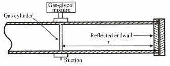 1 实验方法实验所用的激波管驱动段长度为2m,被驱动段4m,截面积为95×95mm2。图 1是测试段简图,反射距离L定义为端壁到气柱中心的距离,实验中L=90mm。入射激波马赫数Ma=1.23±0.01,反射激波马赫数Ma=1.22±0.01(这里考虑了反射激波前气流的速度)。实验前,首先将实验气体充入位于实验段上方的箱体中,并用氧气浓度检测仪测定箱体顶部出口处氧气的浓度,当氧气浓度下降至0.5%以下则认为箱体中充满了实验气体。然后用烟雾机对液态乙二醇进行加热使其变成雾态(平均直径约为0.5 μm,其在RM不稳定性实验研究中作为示踪粒子的可行性已得到验证[20]),并充入箱体中与实验气体混合。打开箱体底部的阀门,实验气体和乙二醇粒子的混合物会在重力的作用下沿着管道自上而下流入测试段,并可通过控制阀门来调节流速的大小使气柱稳定。这样在实验段中就形成了直径约4mm的无膜重气柱界面。采用连续激光片光结合高速摄影相机(FASTCAM SA5,Photron Limited)进行流场显示。连续激光器(SDL-532-15000T,15W,532nm)产生初始光斑直径为10mm的连续激光相继通过一个凹柱面镜(焦距50mm)和一个凸透镜(焦距500mm)能够形成厚度约1mm、宽度约80mm的连续激光片光。激光片光经过安装在侧壁上的石英玻璃进入测试段,照射位于管口下34mm处的界面截面。高速摄像机安装在测试段的上方,对流场进行连续拍摄。具体的实验参数见表 1。