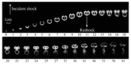 | 图 2 入射激波和反射激波作用下SF6气柱界面的演化,第一帧显示的是初始界面,入射激波从下往上运动,Δt=33.3 μs Fig. 2 Evolution of a SF6 gas cylinder accelerated by an incident shock and its reshock. The first frame gives the initial interface and the incident shock wave moves from the bottom to the top,Δt=33.3μs |