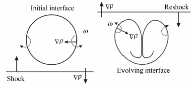| 图 3 入射激波(左)和反射激波(右)作用下SF6气柱界面涡量产生与分布示意图 Fig. 3 Schematic diagram of vorticity generation and distribution when a SF6 gas cylinder is impacted by an incident planar shock (left) and reshock (right) |