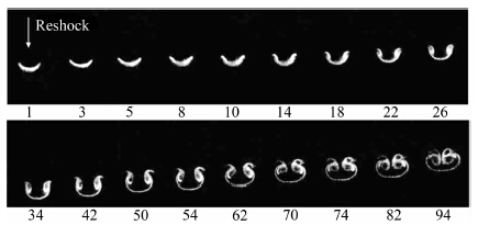 | 图 4 反射激波作用后氩气柱界面的演化。第一帧是反射激波到达时的界面形态,入射激波从下往上运动,Δt=28.6 μs Fig. 4 Evolution of an argon gas cylinder accelerated by the reshock. The first frame is the initial interface for the reshock and the incident shock wave moves from the bottom to the top,Δt=28.6 μs |