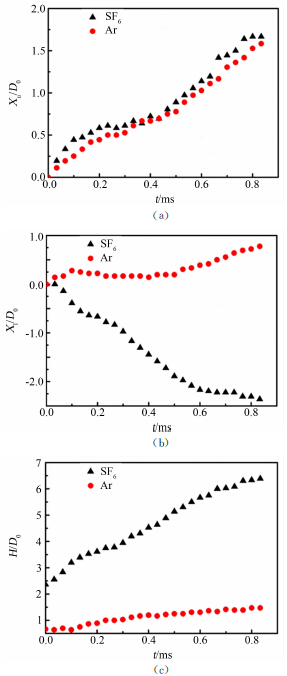 | 图 5 SF6和氩气柱结构尺寸随时间的变化曲线。“上界面”位移Xu (a);“下界面”位移Xl (b);界面高度H (c)Fig. 5 Changes of dimensions of the SF6 and argon gas cylinders. The displacement of the upper interface Xu (a); the displacement of the lower interface Xl (b); and the height of the interface H (c) |
