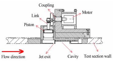 射流器模型主要由驱动装置、控制装置、联轴器、连杆、活塞和汽缸等部件组成,其中驱动装置用于提供运动所需的能量,联轴器的作用是将旋转运动转化为往复直线运动,连杆用于推拉活塞做往复运动,通过改变连杆的长度实现活塞振幅的变化,活塞运动时,气体会通过射流出口吸入或排出汽缸,从而实现零净质量流率的合成射流。射流出口位于空腔前缘,合成射流可对来流产生扰流,使空腔流动特性发生变化。射流器模型示意图如图 1所示。