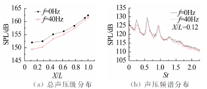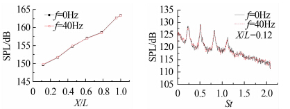 图 11给出了Ma=1.5时的试验结果。图示结果表明,采用该方法进行流动控制后,空腔底部总声压级分布曲线以及典型测点声压频谱曲线均基本无变化。造成上述现象的原因是:超声速条件下,空腔流场自持振荡机制较稳定,合成射流能量较小,不能破坏气动声学回路,另外,合成射流的转化效率与无风状态相比可能有所降低。