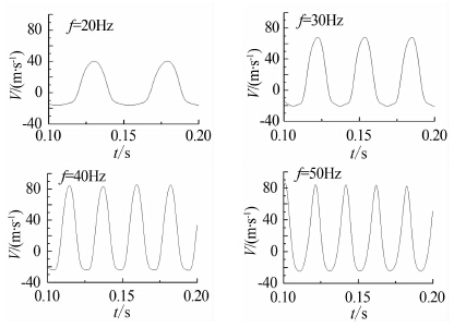 上图表明,射流速度呈周期性变化,其频率与射流器激励频率一致,正向射流速度极值(V+max)远大于负向速度极值(V-max)。f≤40Hz时,V+max随激励频率增加显著增大,f>40Hz后,V+max增幅明显减小,这表明气体压缩性开始显现。