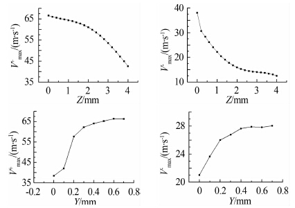 图 5给出了对应1号射流堵块,f=30Hz、l=10mm时,射流速度极值在Z向及Y向的分布。